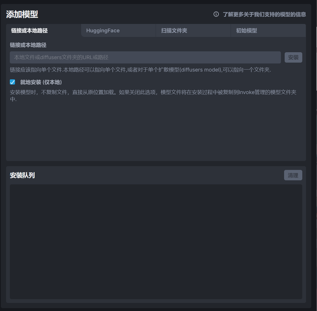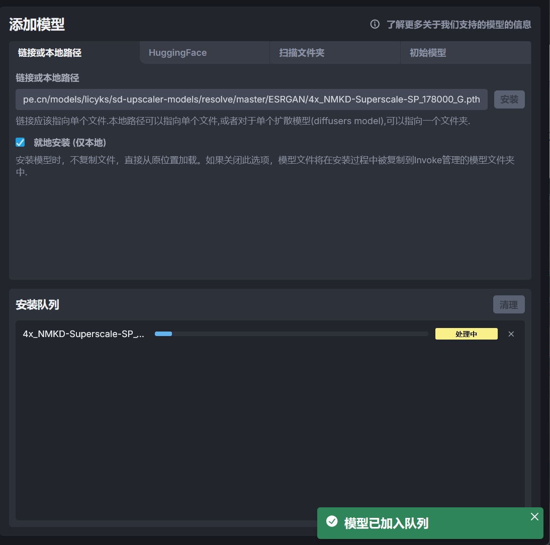 链接或本地路径选项支持使用模型的下载链接或者模型的本地路径添加模型到 InvokeAI 中,如果使用链接下载模型,请确保模型的下载链接为直链。