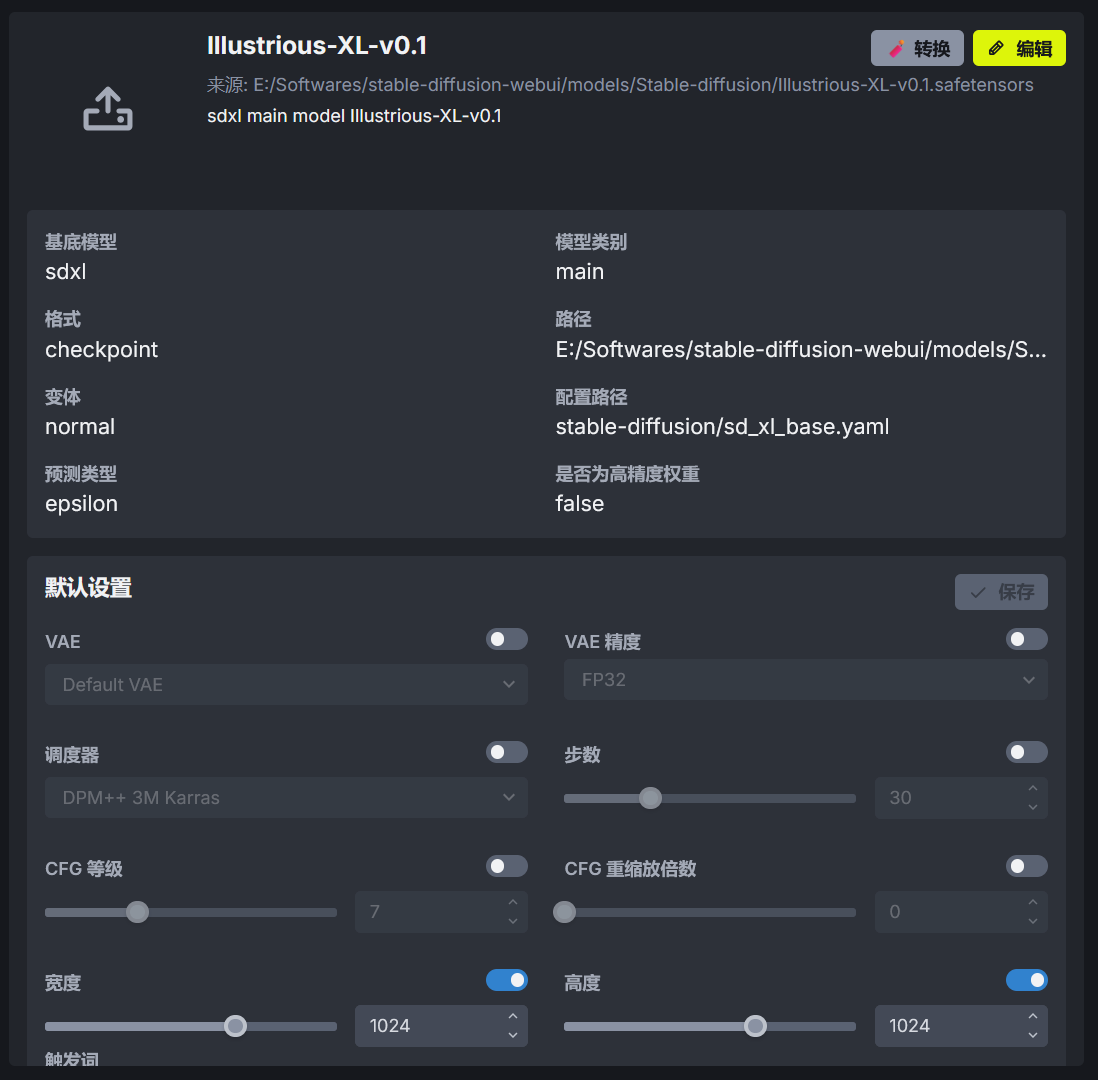 编辑按钮可以编辑模型的配置。部分模型需要修改模型配置才能正常使用,比如 NoobAI-XL 模型的 V 预测版本,需要将模型的预测类型修改为 v_prediction。