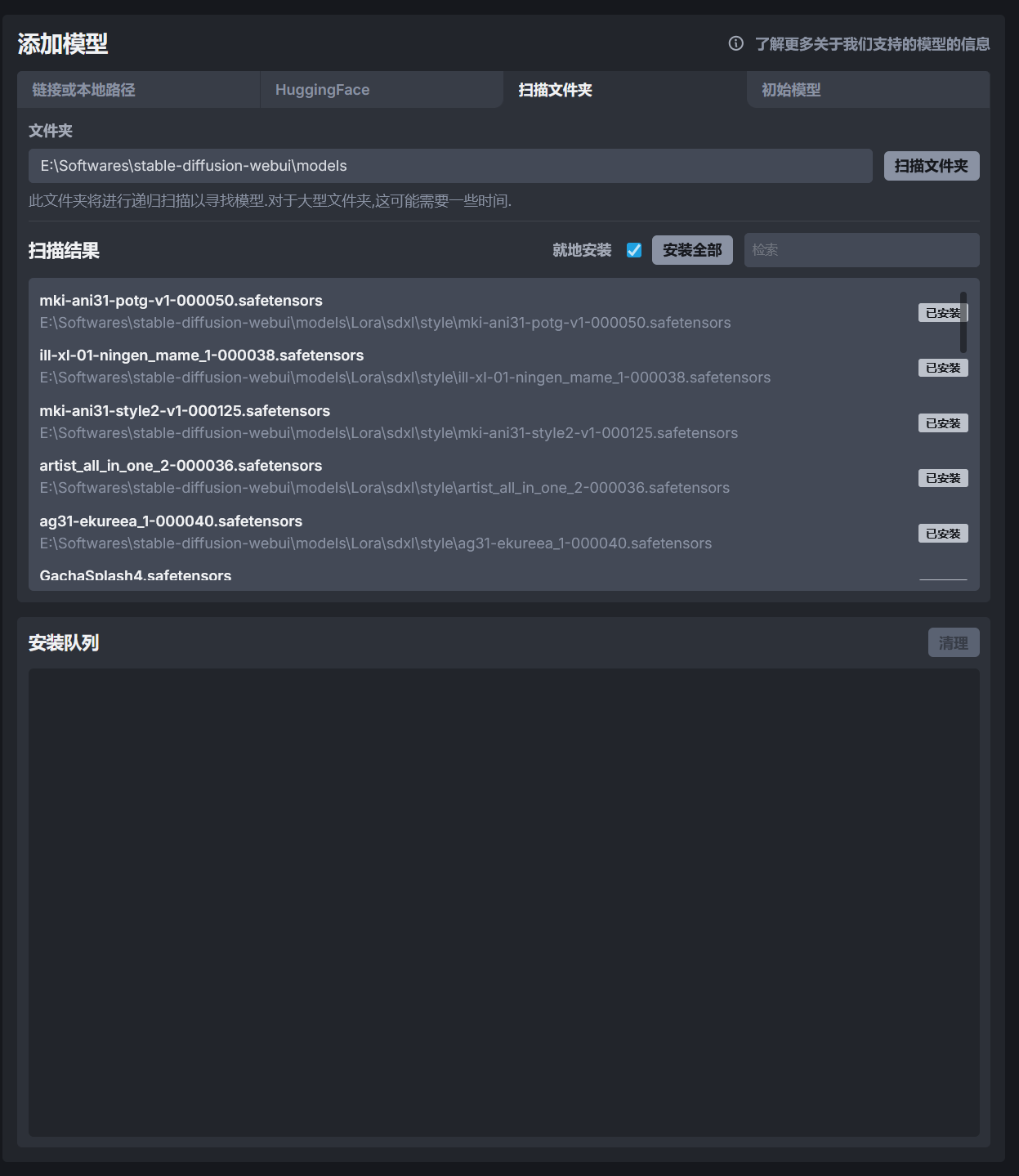 如果在本地安装了 Stable Diffusion WebUI、ComfyUI 或者其他基于 Stable Diffusion 的 WebUI,可以使用扫描文件夹功能从这些 WebUI 的模型文件夹添加模型。