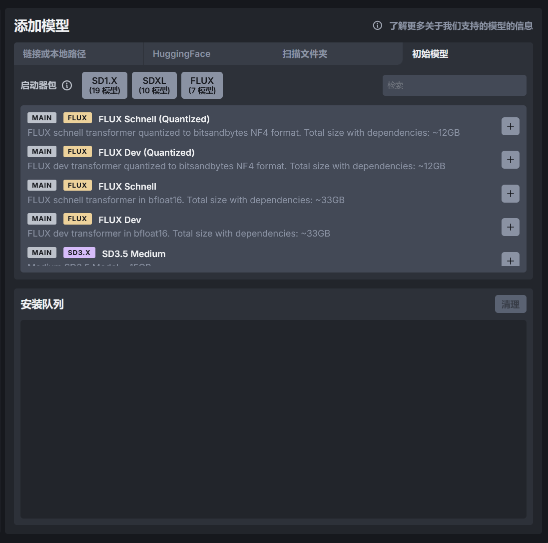 初始模型选项包含了一些常用的模型,比如大模型、放大模型、ControlNet 模型、IP Adapter 模型等,根据自己的需求下载即可。