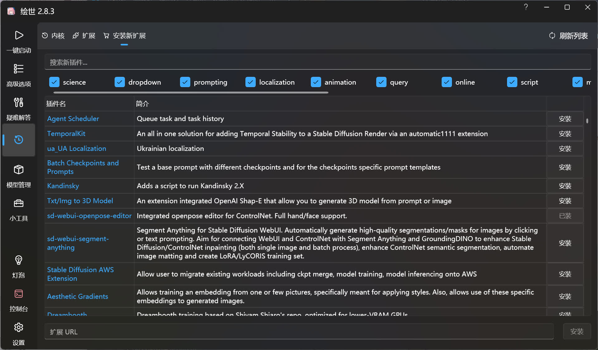 界面最底下有个扩展 URL 输入框,将扩展的安装地址输入进去后,点击右侧的安装按钮即可开始安装。